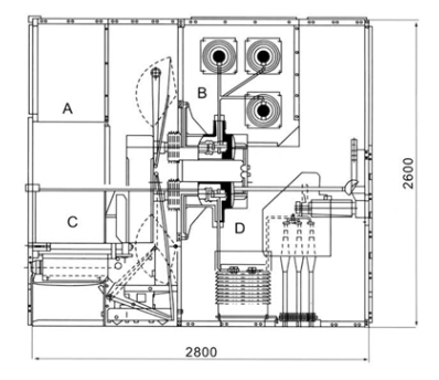 | Dimensions (WxDxH): 1400x2800x2600 | Schematic diagram of the structure of the स्विचगेर A relay instrument room B bus room C circuit breaker room D cable |